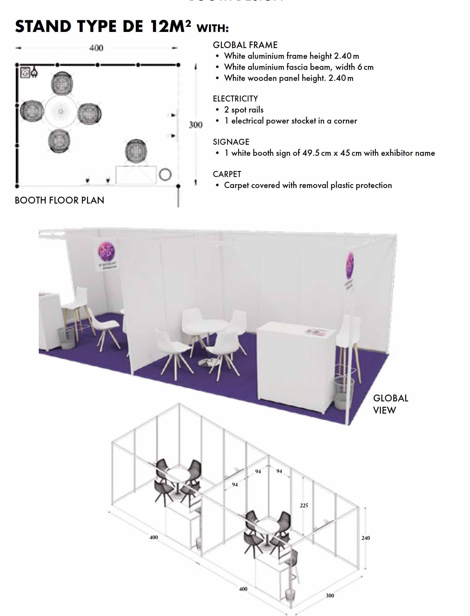 The booths are all identical : 4m x 3m = 12m2 and 2,40m high (see booth design).