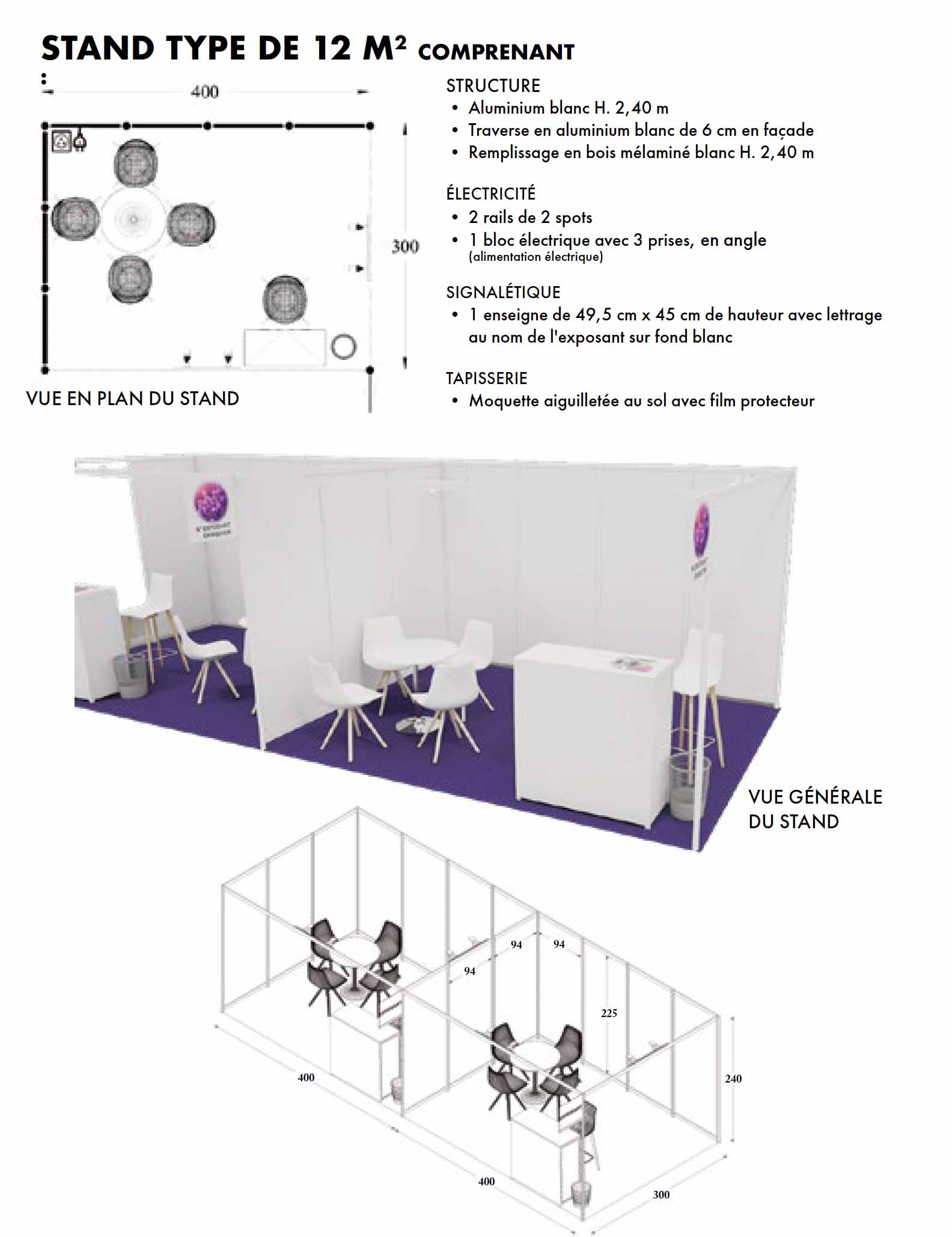 Les stands sont tous identiques : 4m x 3m = 12m2et 2.40m de hauteur (voir plan).